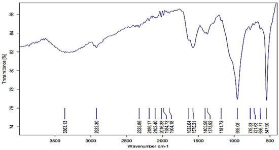 According to the FTIR investigation results, many of the functional groups had fluctuating absorption peaks at 547.90 cm−1, 955.08 cm−1, 1405.56 cm−1, 1575.21 cm−1, 1632.64 cm−1, 2922.30 cm−1, and 3363.13 cm−1 (Figure 5). The FTIR spectrogram band at 3363.13 cm−1 belongs to N-H. The band at 2922.30 cm−1 is a result of the C-H stretching of the aliphatic or methylene group. In contrast, the band peak at 1575.21 cm−1 is the amino peak, and the band peak at 1632 cm−1 indicates conjugated ketone or quinone. About 955 cm−1 is required for the vinyl C-H out-of-plane bend. The C-I stretch in the strong band seen at 547 cm-1 was caused by aliphatic iodo compounds. The band peak at 1405.56 could be a result of the stretching of the C-O group.