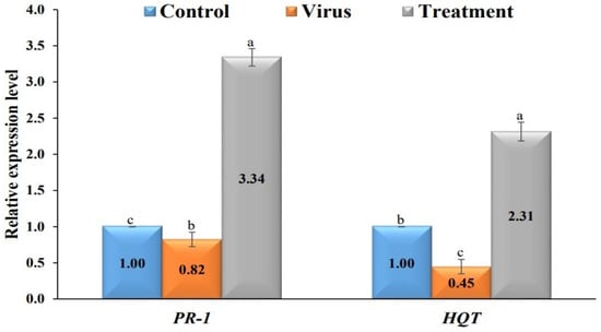 Relative expression levels of PR-1 and HQT genes at 20 dpi in response to treatments. Control, healthy control plants; Virus, plants inoculated with BYMV only; Treatment, faba bean plants foliar sprayed with AgNPs 24 h before BYMV inoculation. Columns reflect the mean value from three biological replicates, and the standard deviation (SD) values are shown in the bars. Columns with the same letter above are not statistically different.