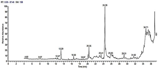 A GC-MS analysis was performed to identify the bioactive components of the Rhizobium leguminosarum (33504-Borg 1) bacterial filtrate. The active constituents of the bacterial isolate ethyl acetate filtrate fractionated at retention times (RT) are shown in Figure 7 and Table 4. The analyzed data revealed the presence of a high relative abundance of oleic acid, with the highest peak area percentage of 20.23% at RT 24.39 min, followed by 4H-1-benzopyran-4 one, 2-(3,4-dimethoxy phenyl)-3, 5-dihydroxy-7-methoxy- (5.66%) at RT 34.72 min, and 1-hexadecanol, 2-methyl- (4.48%) at RT 25.82 min. According to mass spectrometry libraries, other constituents differed in retention time and peak area detected and quantified.