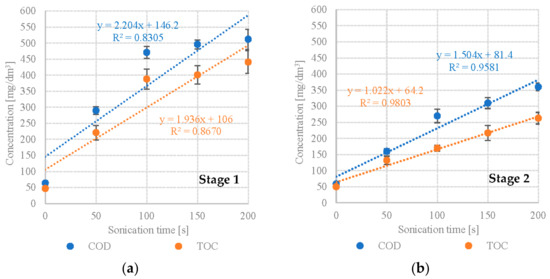 Our study showed a significant increase in the levels of monitored dissolved organic compounds. S1 showed significant increases in COD and TOC in variants S1V1 to S1V3. S1V1 (Scenedesmus sp., no DU) had a COD of 64 ± 7 mgO2/dm3 and TOC of 47 ± 6 mg/dm3 (Table 1). The values for S1V3 were 471 ± 19 mgO2/dm3 and 388 ± 31 mg/dm3, respectively (Table 1). The gains were less dramatic in the subsequent variants. In S1V5, the COD was 512 ± 31 mgO2/dm3, whereas TOC was 441 ± 35 mg/dm3 (Table 1). UD exposure time was found to strongly and positively correlate with dissolved COD (R2 = 0.8305) and TOC (R2 = 0.8670) levels (Figure 1a). S2 (Pinnularia sp.) experienced a consistent, statistically significant rise in levels of dissolved organic compounds across all of the tested UD intensities. COD increased from 59 ± 4 mgO2/dm3 in S2V1 to 360 ± 12 mgO2/dm3 in S2V5 (Table 1). TOC ranged from 50 ± 2 mg/dm3 to 263 ± 18 mg/dm3 (Table 1). The concentrations of dissolved organic compounds were much lower than in S1. UD exposure time in S2 was found to correlate very strongly and positively with dissolved COD (R2 = 0.9581) and TOC (R2 = 0.9803) levels (Figure 1b).