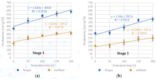 The present study showed that UD had a positive effect on anaerobic digestion of microalgal biomass, providing significantly better biogas and methane production performance during digestion of Scenedesmus sp. Specific biogas yield in S1V1 was 371 ± 21 cm3/gVS with a CH4 fraction of 49.2 ± 2.4%, which corresponds to CH4 productivity of 183 ± 25 cm3/gVS. Significant improvements in anaerobic digestion performance were observed up to S1V3. Extending UD duration to 100 s boosted the CH4 yields to 284 ± 11 cm3/gVS. The highest AD performance for Scenedesmus sp. was obtained in S1V4 and S1V5 (150 s and 200 s UD, respectively), with no statistically significant differences in CH4 production between the two (S1V4—309 ± 13 cm3/gVS, S1V5—313 ± 15 cm3/gVS). The CH4 fraction in the biogas was similar across all of the UD variants, falling within the range of 53.2 ± 1.7% (S1V3) to 54.9 ± 0.9 (S1V4). A very strong positive correlation (R2 = 0.9126) and a strong positive correlation (R2 = 0.8718) were found between UD exposure time and biogas/methane production (Figure 2a).