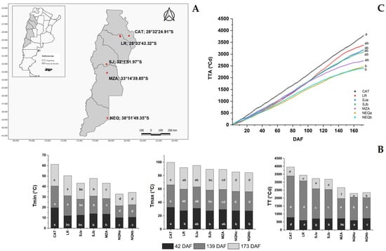 (A) Map of the study area in Argentina covering multiple provinces along the latitudinal growth gradient (Catamarca (CAT) 2014/15, La Rioja (LR), 2015/16, San Juan (SJa), 2014/15, San Juan (SJb), 2015/16, Mendoza (MZA), 2015/16, Neuquén (NQNa), 2014/15 and Neuquén (NQNb), 2015/16). The geographical location of the sampled sites is indicated in red. (B) Average minimum and maximum temperatures and accumulated degree days detected at 42, 139 and 173 DAF for the different environments; (C) accumulated thermal time (TT, °C d) registered from full flowering to fruit veraison in the seven analyzed growing environments. Different letters correspond to significant differences at p < 0.05 among environments for a given phenological stage.