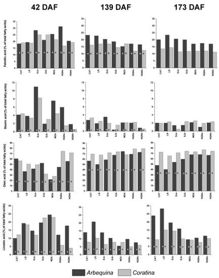 The low percentage of oleic acid in hot environments corresponded, as expected, to a parallel increase in the percentage of linoleic acid, confirming that at high temperatures, oleic acid is actively converted into linoleic acid. The oleic acid concentration of cv. Coratina was not affected by the high temperatures and remained constant and higher than that of cv. Arbequina. In all seven studied environments, cv. Arbequina had the highest C18:1 139 DAF, whereas 173 DAF, in the environments with higher maximum and minimum temperatures, the amount of this acid decreased. Only a few cultivars, such as Arbequina and some others used in new intensive groves, are able to achieve consistent yields under new environmental conditions, often reflecting negative changes in their fatty acid profiles [18].