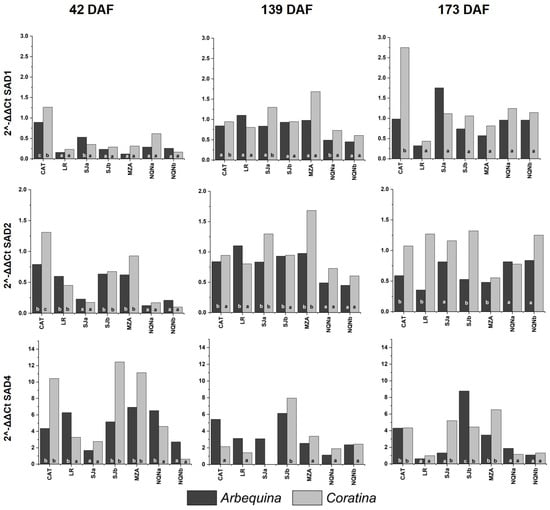 It was observed that the three SAD genes evaluated in all tested growing environments had similar expression patterns in both Arbequina and Coratina cultivars (Figure S1 Supplementary).