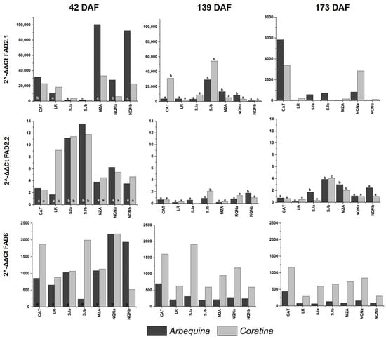 The expression of FAD6 resulted in significant differences among environments only for the Arbequina cultivar at first time point of sampling (42 DAF), although the level of expression was higher for cv. Coratina at all sites, except the coldest site, Neuquén b. Moreover, 139 and 173 DAF, differences among environments were not significant for either cultivar.