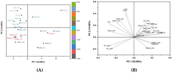 The PCA, which included 23 variables, explained 32.80% of total variability for PC1 and 14.89% for PC2 (Figure 5). All environments at 42 DAF were in the positive plot area of PC1 without any correlation with the environment. In contrast, the PCA clearly separated the other two time points in relation to each environment. In fact, all the colder environments for both 139 and 173 DAF were in the plot area where the oleic acid is the principal loading, whereas the warmer areas were located in the area characterized by the maximum gene expression of SAD1 and SAD2, as well as thermal time. The hottest Catamarca and La Rioja environments were separated from the others for the highest values of temperatures (minimum and maximum), accumulated degree days and expression of SAD1 and partially SAD2 for both cultivars. Furthermore, a negative correlation was observed between the expression of FAD2-1 and FAD2-2 and the oleic acid content (C18: 1), with a positive correlation between FAD2-2 and linoleic acid content (C18: 2) for both cultivars.