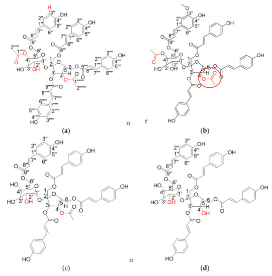 White amorphous powder; m.p 150.0–151.0 °C; HRESIMS [M-H]− at m/z 1039.2697 (1039.9642 ([M-H]− calc.) or [M] at m/z 1040.2697 (1040.9642 ([M] calc.); FTIR spectra showed absorption bands at (cm−1) 3334.8 (hydroxyl); 2953.3 (C-H aliphatic); 1704 (C-carbonyl) and 1629.4; 1605.3, and 1513.7 (aromatics rings); 1H NMR (700 MHz; acetone-d6): fructose-δH 4.38 (1H, d, 4.4, H-1a), 4.20 (1H, d, 12.0, H-1b), 5.62 (1H, d, 7.9, H-3), 4.82 (1H, dd, 3.7, 10.8, H-4), 4.30 (1H, t, 8.0, H-5), 4.62 (1H, dd, 12.1, 3.4, H-6a), 4.48 (1H, d, 6.8, H-6b); glucose-δH 5.76 (1H, d, 3.7, H-1′), 4.68 (1H, t, 8.0, H-2′), 4.50 (1H, t, 7.1, H-3′), 4.96 (1H, t, 9.4, H-4′), 4.11 (1H, q, 18.0, 9.6, H-5′), 4.41 (1H, dd, 2.2, 12.2, H-6′a), 4.21 (1H, d, 4.9, H-6′b); feruloyl moiety-δH 7.38 (1H, s, H-2″), 6.90 (1H, d, 8.4, H-5″), 7.15 (1H, d, 8.2, H-6″), 7.78 (1H, d, 15.8, H-7″), 6.54 (1H, d, 15.9, H-8″), 3.91 (3H, s, 3″-OCH3); p-coumaroyl moieties-δH 7.54 (2H, d, 8.64, H-2/6′″), 7.56 (2H, d, 8.64, H-2/6″″), 7.56 (2H, d, 8.64, H-2/6′″″), 6.89 (2H, d, 8.4, H-3/5′″), 6.89 (2H, d, 8.4, H-3/5″″), 6.94 (2H, d, 8.52, H-3/5′″″), 7.71 (1H, d, 15.96, H-7′″), 7.67 (1H, d, 9.18, H-7″″), 7.65 (1H, dd, 8.28, 1.74, H-7′″″), 6.51 (1H, d, 15.9, H-8′″), 6.45 (1H, d, 18.0, H-8″″), 6.40 (1H, d, 15.96, H-8′″″); ethanoyl moieties-δH 2.0 (3H, s, H-2″″″), 2.1 (3H, s, H-2″″″′). 13C NMR (175 MHz; acetone-d6): fructose-δC 65.0 (C-1), 102.6 (C-2), 78.2 (C-3), 72.6 (C-4), 80.3 (C-5), 64.3 (C-6); glucose-δC 89.2 (C-1′), 73.3 (C-2′), 68.6 (C-3′), 71.4 (C-4′), 68.8 (C-5′), 63.1 (C-6′); feruloyl moiety-δC 126.5 (C-1″), 110.4 (C-2″), 149.3 (C-3″), 147.9 (C-4″), 116.0 (C-5″), 123.4 (C-6″), 146.1 (C-7″), 115.1 (C-8″), 167.0 (C-9″), 55.5 (C-3″OCH3); p-coumaroyl moieties-δC 126.0 (C-1′″), 125.96 (C-1″″), 125.9 (C-1′″″), 130.2 (C-2/6′″), 130.23 (C-2/6″″), 130.4 (C-2/6′″″), 115.84 (C-3/5′″), 115.84 (C-3/5″″), 116.0 (C-3/5′″″), 159.9 (C-4′″), 159.92 (C-4″″), 160.2 (C-4′″″), 145.5 (C-7′″), 145.3 (C-7″″), 145.1 (C-7′″″), 114.1 (C-8′″), 114.2 (C-8″″), 114.5 (C-8′″″), 166.0 (C-9′″), 166.03 (C-9″″), 166.5 (C-9′″″); ethanoyl moieties-δC 170.1 (C-1″″″), 20.0 (C-2″″″′), 169.6 (C-1″″″′), 20.1 (C-1″″″′). (For detailed assignment, see Figure S2 in Supplementary Materials).