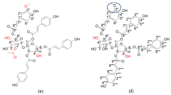 Chemical structure of (a) polygonumins A; (b) polygonumins B; (c) polygonumins C; (d) polygonumins D; (e) vanicoside A; (f) vanicoside B. Circle in blue is an example of a methoxyl group attached at C-3″. Circle in red is an example of an ethanoyl group attached at furanose ring C-4.