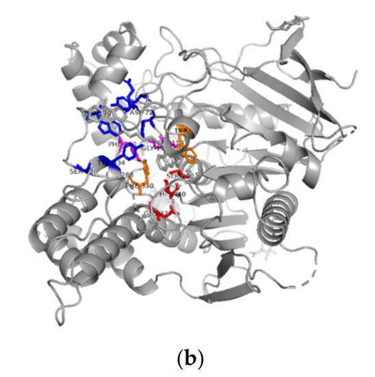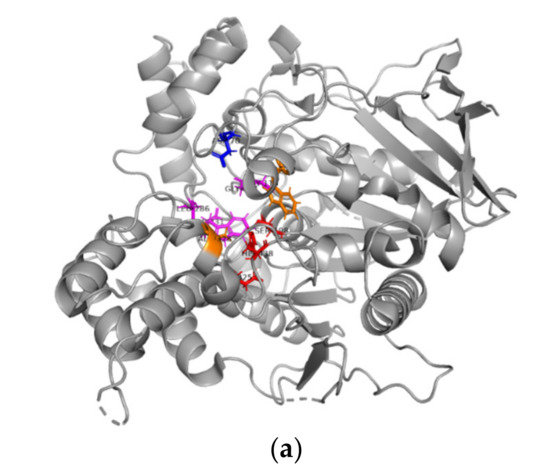 The crystal structure of (a) BChE (PDB: 4BDS). The main contributors to the peripheral anionic site (Asp70), the catalytic anionic subsite (Trp82 and Ala328), the catalytic triad (His438, Glu325 and Ser198) and the acyl-binding pocket (Gly116, Gly117, Trp231, Leu286 and Val288) are shown as sticks. The interactive binding pocket obtained from crystal structure of human BChE [46]. (b) The crystal structure of AChE (PDB: 2CKM). The main contributors to the peripheral anionic site (Asp72, Tyr121, Trp279, Tyr70, Ser286 and Tyr334: blue), the catalytic anionic subsite (Trp84 and Phe330), the catalytic triad (His440, Glu327 and Ser200) and the acyl-binding pocket (Gly118, Gly119, Phe290 and Phe288) are shown as sticks. The interactive binding site obtained from Torpedo californica AChE [47,48]. The crystal structure was obtained from the Protein Data Bank, shown as a gray cartoon with the key amino acids of the active site shown as sticks. The protein structure with active sites was generated and analyzed using the PyMOL visualization tool. The peripheral anionic site is highlighted in blue, the catalytic anionic subsite is highlighted in orange, the catalytic triad is highlighted in red and the acyl-binding pocket is highlighted in magenta.