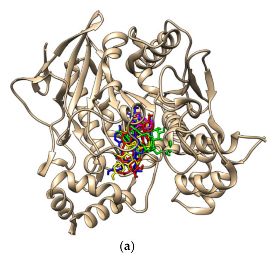 Overall, the AChE– and BChE–ligand complex docking results revealed that the polygonumins derivatives were stably positioned in several pockets/catalytic regions of AChE and BChE, all of which were 5 Å from the inhibitor in the original complex (Figure 3a,b). The data clearly show that polygonumins derivatives prefer binding at hydrophilic protein pockets in the BChE; however, the polygonumins derivatives prefer binding at hydrophobic protein pockets in the AChE, as can be observed in Figure S5 in the Supplementary Materials.