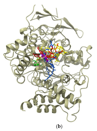 Molecular docking analysis of (a) the BChE protein structure: 4BDS and (b) the AChE protein structure: 2CKM. (polygonumins A: red stick; polygonumins B: blue stick; polygonumins C: yellow stick; polygonumins D: green stick; tacrine: magenta.)