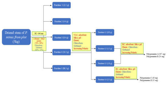 Dried ground stem bark of Polygonum minus (5 kg) was macerated with 3 × 4 L of methanol by agitation at room temperature. The extracts were combined and concentrated using a rotary evaporator at 50 °C to yield 120 g of dark green extract. The whole extract was fractionated on a silica gel column eluted with a gradient of increasing polarity of chloroform to 100% methanol. The eluents were monitored by thin layer chromatography (TLC) and combined to give five fractions. Fraction four was further subjected to column chromatography (D = 5 cm) using a varied ratio of chloroform and methanol as the solvent system. The eluates showing the same profile on TLC were combined to give four subfractions. Purification of subfraction 4.2–4.3 (3.1 g) was carried out using radial chromatography (RC) with a silica gel plate of 2 mm thickness eluted with chloroform and methanol (8.5:1.5) in 5% polarity increments to yield polygonumins A (107 mg) and polygonumins B (34 mg). Purification of subfraction 4.4 (3.3 g) was conducted by utilizing another RC with a silica gel plate of 2 mm thickness. Elution with chloroform and methanol (7:3) produced polygonumins C (20 mg) and polygonumins D (15 mg). A schematic flow chart of the isolation and extraction procedures is shown in Figure 4.