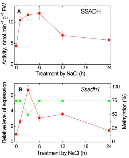 Figure 1. Succinic semialdehyde dehydrogenase (SSADH) activity (A), and expression (red squares) and promoter methylation (green circles) of the Ssadh1 gene (B) after the transfer of maize seedlings in 150 mM NaCl. The data on activity and expression represent the means of three biological repeats ± SD. The control (untreated) did not exhibit statistically significant changes in the variation level.