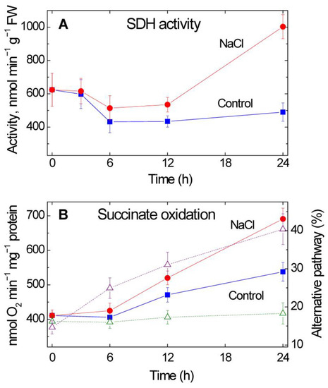 Many areas on Earth are affected by salinity, and NaCl represents the most abundant salt causing salt stress in plants [1]. During the adaptation to salt stress conditions, plants involve the salinity tolerance mechanisms, which include limiting ion uptake, compartmentalizing ions, and preventing negative osmotic effects on cell functions. The capacity of mitochondrial respiration and its flexibility in the adaptation to changing environment are most essential for developing tolerance to salt stress [1]. This includes the support of efficient ATP generation, scavenging of reactive oxygen species (ROS), and the mitochondrial regulation of osmolyte concentrations. Succinate is accumulated in stress conditions in plants, and the increase in its oxidation in mitochondria represents one of important features of stress response [2]. This increase corresponds to the phenomenon of “salt respiration” [3], which is related to the modulation of redox balance in mitochondria and ROS formation [4], and the activation of respiratory enzymes and transporters at the transcriptional, translational, and post-translational levels [5].