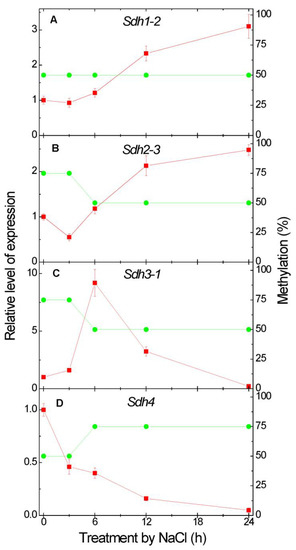 Figure 3. Expression (red squares) and promoter methylation (green circles) of the Sdh1-2 (A), Sdh2-3 (B), Sdh3-1 (C) and Sdh4 (D) genes after the transfer of maize seedlings in 150 mM NaCl. The expression data represent the means of three biological repeats ± SD. The control (untreated) did not exhibit statistically significant changes in the variation level.