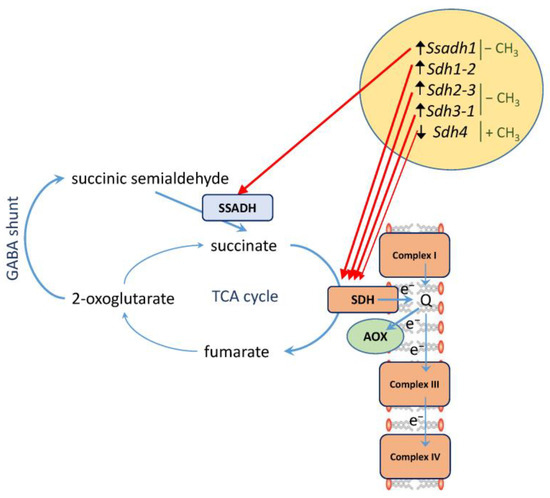 Figure 4. Scheme of succinate metabolism in maize leaves under salt stress. In the conditions of salt stress, the TCA cycle is bypassed via the GABA shunt. Succinic semialdehyde dehydrogenase (SSADH) supplies succinate to succinate dehydrogenase (SDH) which three subunits are induced at the level of transcription of the corresponding genes, while the expression of the fourth subunit is suppressed. The changes in expression are controlled by methylation of promoters of the corresponding genes (− CH3, decrease in methylation level; + CH3, increase in methylation level). The flow of electrons via alternative oxidase (AOX) is increased. Thick arrows indicate the processes that are activated, thin arrows show the processes that do not change or are suppressed.