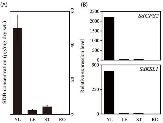 Quantification of SDB production and qRT-PCR analysis of the expression level of SdCPS2 and SdKSL1 in S. dulcis tissues. (A) Quantification of scopadulcic acid B (1) by HPLC in S. dulcis tissues. YL: young leaf, LE: leaf, ST: stem, and RO: root. (B) The 18S rRNA gene was used for normalization. The transcript level of each gene in the root was set to 1.0.