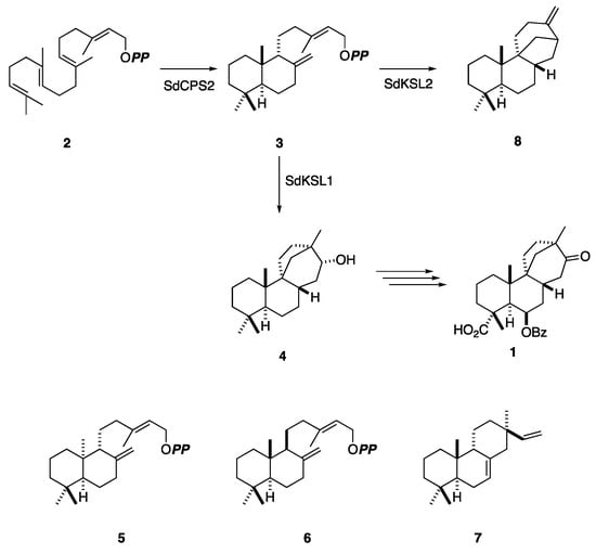 Plants produce a vast array of secondary metabolites, and these natural products are of increasing importance as a resource for drugs and drug leads. The chemical diversity of natural products is enormous, and is derived from its biosynthetic machinery. Among important natural products, terpenes are the largest group, and they range from simple flavor and fragrance compounds to complex triterpenoids. Large populations of terpenes are cyclic compounds possessing several chiral centers, and the cyclization catalyzed by terpene synthases is the first step in constructing their diverse structures. Scopadulcic acid B (SDB, 1) is a unique tetracyclic diterpenoid produced by a perennial medicinal herb, Scoparia dulcis L. (Plantaginaceae, Lamiales), which is distributed among tropical and subtropical regions [1]. SDB, 1 has attracted substantial attention both for its multiple biological effects and its unique tetracyclic skeleton. Early studies suggested that the SDB biosynthetic process was initiated by two sequential steps: the formation of syn-copalyl diphosphate (syn-CPP, 3) from geranylgeranyl diphosphate (GGPP, 2), and the subsequent cyclization of the tetracyclic skeleton from 3 (Scheme 1). Such dual cyclization schemes are characteristic machinery for the biosynthesis of labdane-related diterpenoids (LRDs) [2,3].
