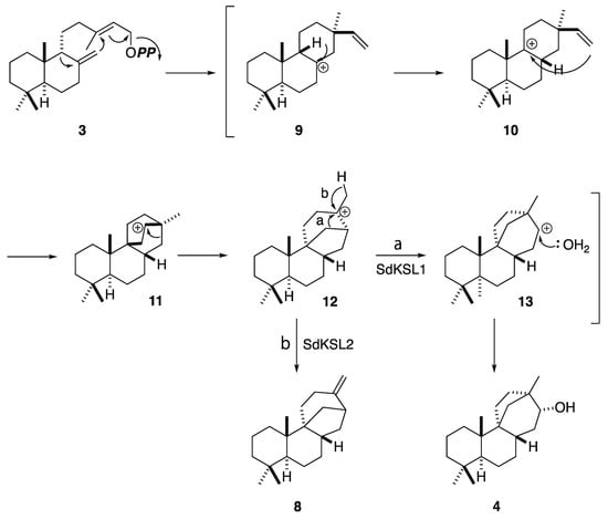 In this report, we discovered three diterpene synthases responsible for the unique tetracyclic diterpene biosynthesis in S. dulcis. Reaction mechanisms of SdKSL1 and SdKSL2 are proposed, as shown in Scheme 2. At first, the lysis of the allylic diphosphate ester in 3 induces type A cyclization, initiated by the formation of an allylic cation, followed by si-face attack of the olefin, which is accompanied by a hydride shift from C-9 to C-8 to afford the 8β-pimarenyl cation (10) [5]. The carbocation is suggested to cyclize with the vinyl group to give 11, and rearrangement of 11 provides secondary cation 13, via tertiary cation 12. This undergoes trapping with the nucleophilic oxygen of water, to give tetracyclic diterpene alcohol 4. On the other hand, SdKSL2 is suggested to produce an aphidicol-16-ene (8). S. dulcis has been reported to produce an aphidicolane-type diterpene, scopadulin [16]. Thus, the functionally active SdKSL2-related enzyme may be involved in the biosynthesis of scopadulin.