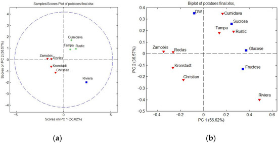 Principal component analysis (PCA) of the obtained data was accomplished using four variables (the contents of fructose, glucose and sucrose, as well as the dry matter), leading to the model from Figure 2a, which explains 93.19% of data variability, revealing two data clusters—one including the cultivars Cumidava, Tampa and Rustic, while the other one includes the cultivars Christian, Kronstadt, Roclas and Zamolxis. The first cluster contains medium-late cultivars, suitable for autumn-winter consumption, their tubers being characterized by the highest concentrations of sucrose and glucose and the highest loadings on the second principal component (PC2). The second cluster includes cultivars with lower concentrations of fructose and glucose, with low loadings on both PC1 and PC2. The Riviera cultivar has a distinct position in this context, being the only genotype which exhibited the highest amounts of fructose and glucose, containing in the meantime an important amount of saccharose.
