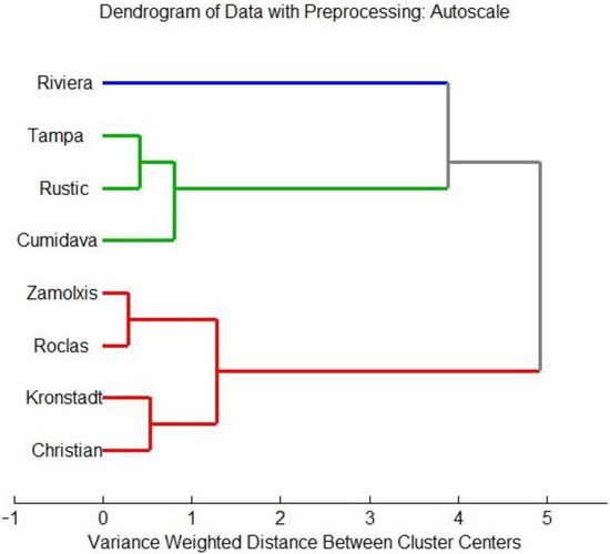 The biplot from Figure 2b reveals a positive correlation between the content of reducing carbohydrates; the correlation analysis (Table 2) for the obtained data also shows a strong and significant correlation between the concentrations of fructose and that of glucose, with a high Pearson’s coefficient (0.8748), which is in agreement with the former reported results [8,12]; sucrose was also significantly correlated with the reducing carbohydrate content but with lower coefficients, showing a moderate relationship with the reducing carbohydrate content for the studied genotypes at harvest. Cluster analysis was accomplished by Ward’s method, using Mahalanobis distance, leading to the dendrogram from Figure 3, validating the results obtained by PCA.