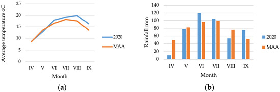 Average temperatures (a) and the amount of rainfall (b) during the vegetation period (MAA: multi-annual average).