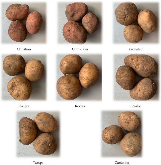 - INCDCSZ Catalogue—Official Catalogue of Romanian Potato Varieties from the National Institute of Research and Development for Potato and Sugar Beet Brasov, Romania. Available online: http://www.potato.ro/_publicatii_files/soiuri/soiuri/Soiuri%20romanesti%20Eng.pdf (accessed on 25 May 2022).