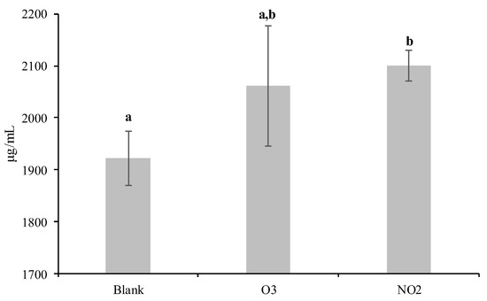 Average and standard deviation of the total soluble protein content of Dactylis glomerata pollen non-exposed to pollutants (Blank) and exposed to O3 and NO2 gaseous pollutants during 6 h at the limit value recommended for the protection of human health in Europe (O3: 0.061 ppm and NO2: 0.025 ppm; European Union Directive 2008/50/EC). Different letters indicate values statistically significantly different (ANOVA test followed by Tukey HSD post hoc, p < 0.05).