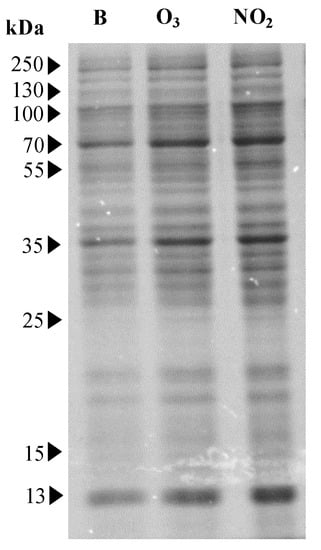 The amount of Dactylis glomerata soluble protein increased significantly (p < 0.05) in the pollens that were exposed to NO2 (2100 ± 29 µg/mL) when compared to the blank sample (1922 ± 53 µg/mL) but not when the pollens were exposed to O3 (2061 ± 115 µg/mL) (Figure 1). However, the SDS-PAGE analysis of the soluble proteins extracted from the pollens demonstrated similar profiles between the blank and the NO2 and O3 exposed samples. After Coomassie staining, several bands ranging from 13 to 100 kDa were observed (Figure 2). However, bands within the 13–55 kDa range exhibited higher intensity for the pollen samples exposed to the pollutants.