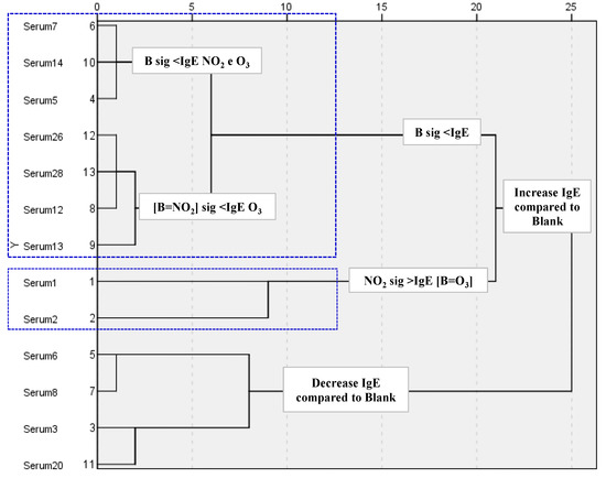However, the subsequent ELISA analysis allowed us to evaluate if the changes induced by the two pollutant gases in total IgE reactivity were statistically significant. Only 13 sera samples exhibited significant differences when compared with the blank sample. A cluster analysis applied to the ELISA results of these 13 sera samples showed a distinction of two sample groups: one that clustered the sera samples presenting a decrease in total IgE reactivity after pollutant exposure when compared with the blank sample (sera 3, 6, 8 and 20), and the other in which a significant increase after O3 or NO2 exposure was observed. However, among this last group, further subdivisions were detected: (i) the IgE reactivity in blank and O3 samples were similar and lower than the NO2 (sera 1, 2); (ii) the IgE reactivity in blank and NO2 samples were similar and lower than O3 (sera 12, 13, 26, 28); (iii) the IgE reactivity in the blank sample was lower than O3 and NO2 (sera 5, 7, 14) (Figure 4).