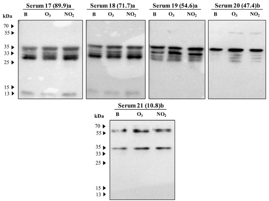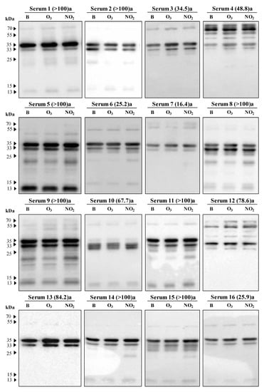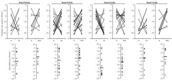 Focusing only on the prominent bands, we could observe that for the 13 kDa band, both gases tend to increase the IgE binding (mean differences higher than 0.528). On the contrary, the IgE reactive band observed at 33 kDa showed a tendency towards a reduction in the IgE binding to the pollen extracts of the polluted samples, particularly visible for the pollen sample exposed to O3 (negative mean difference of −0.959). However, the reactive bands at 55 and 35 kDa presented an increase in the IgE binding pattern for all the patient sera samples exposed to NO2, but for the samples exposed to O3, the results balanced each other with either an increase or decrease, as the mean difference between the values for the IgE binding in O3 exposed and the blank samples was close to zero (Figure 6).