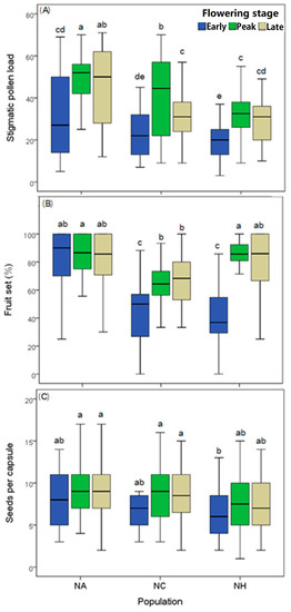 Comparison of stigmatic pollen load (A), fruit set (B), and seeds per capsule (C) for plants from different flowering stages across the three populations. Lower-case letters indicate the results of multiple comparisons.