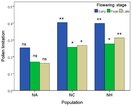 Comparison of pollen limitation (PL index) for plants from different flowering stages across the three populations. Bars with stars refer to the differences between the pollination treatments for each population at a certain flowering stage. Significant level is at p = 0.05: no significance (ns), p ≥ 0.05; * p < 0.05; ** p < 0.01.