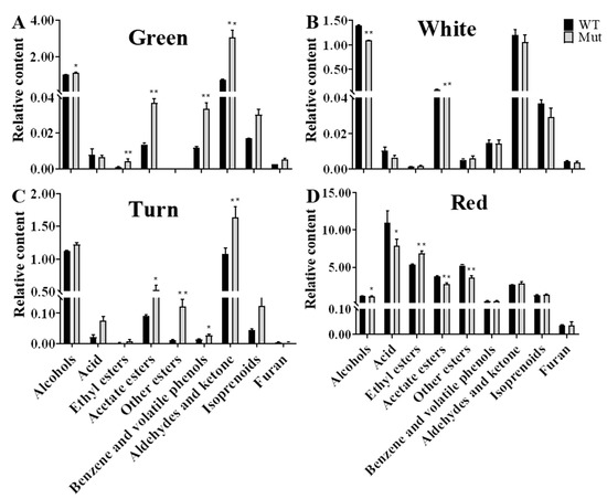 Comparative analysis of the contents of nine categories of volatile components in ‘Sachinoka’ strawberry and its somaclonal mutant ‘Mixue’ at different developmental stages. WT represents cultivated strawberry ‘Sachinoka’. Mut represents somaclonal mutant ‘Mixue’. * (p < 0.05) and ** (p < 0.01) represent significant differences in volatile components contents between the nine major categories of ‘Sachinoka’ strawberry and its somaclonal mutant ‘Mixue’.