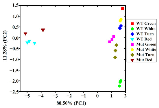 Principal component analysis of the contents of volatile components of ‘Sachinoka’ strawberry and its somaclonal mutant ‘Mixue’ fruit at four developmental stages. WT represents cultivated strawberry ‘Sachinoka’. Mut represents somaclonal mutant ‘Mixue’.