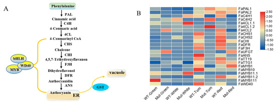 (A) Anthocyanin biosynthetic and regulatory pathway. The green box represents the precursor for anthocyanin biosynthesis; the yellow oval represents transcription factors regulating anthocyanins accumulation; the yellow box represents the endoplasmic reticulum and vacuole; the blue oval represents the anthocyanin transport gene. PAL is phenylalanine ammonia-lyase; C4H is cinnamate 4-hydroxylase; 4CL is 4-coumarate-CoA synthase; CHS is chalcone synthase; CHI is chalcone isomerase; F3H is flavanone 3-hydroxylase; DFR is dihydroflavonol-4-reductase; ANS is anthocyanidin synthase; MYB is MYB transcription factor; WD40 is WD-repeat protein; bHLH is basic helix-loop-helix transcription factor. (B) Expression levels of anthocyanins-related genes of ‘Sachinoka’ strawberry and its somaclonal mutant ‘Mixue’ fruit at four developmental stages. PAL is phenylalanine ammonia lyase; C4H is cinnamate 4-hydroxylase; 4CL is 4-coumarate-CoA synthase; CHS is chalcone synthase; CHI is chalcone isomerase; F3H is flavanone 3-hydroxylase; DFR is dihydroflavonol-4-reductase; UFGT is UDP glucose flavonoid-3-O-glycosyltranferase; TT19 is transparent testa 19; TTG1 is testa glabra 1; MYB is MYB transcription factor; WD40 is WD-repeat protein; ANS is anthocyanidin synthase.
