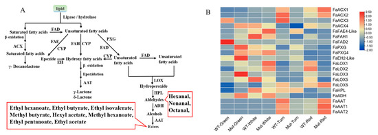 (A) Fatty acid pathway. The green box represents the precursor for the fatty acid pathway; the red boxes represent volatile components that play a major role in strawberry aroma (i.e., odor activity values are greater than 1). FAD is fatty acid desaturase; ACX is Acyl-CoA oxidase; FAE is fatty acid elongase; FAH is fatty acid hydroxylase; CYP is cytochrome P450; EH is epoxide hydrolase; PXG is peroxygenase; LOX is lipoxygenase; HPL is hydroperoxide lyase; ADH is alcohol dehydrogenase; AAT is alcohol acyltransferase. (B) Expression analysis of biosynthetic genes involved in the fatty acid pathway of ‘Sachinoka’ strawberry and its somaclonal mutant ‘Mixue’ fruit at four developmental stages. FAD is fatty acid desaturase; ACX is Acyl-CoA oxidase; FAE is fatty acid elongase; FAH is fatty acid hydroxylase; EH is epoxide hydrolase; PXG is peroxygenase; LOX is lipoxygenase; HPL is hydroperoxide lyase; ADH is alcohol dehydrogenase; AAT is alcohol acyltransferase.