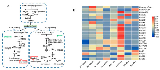 (A) Terpenoid metabolic pathway. The green squares represent substrates of the terpenoid metabolic pathway; the red squares represent volatile components that play a major role in strawberry aroma presentation (i.e., OAV values greater than 1). MVA pathway is mevalonate pathway; MEP pathway is 2-C-methyl-D-erythritol 4-phosphate pathway; G3P is glyceraldehyde 3-phosphate; DXS is 1-deoxy-D-xylulose 5-phosphate synthase; DXR is 1-deoxy-D-xylulose 5-phosphate reductoisomerase; FaQR is Fragaria × ananassa quinone oxidoreductase gene; FaOMT is O-methyltransferase gene; UGT is UDP-glucose transporter; MVK is mevalonate kinase; PMK is phosphomevalonate kinase; FPS is farnesyl pyrophosphate synthase; NES is nerolidol synthase; CMS is 4-diphosphocytidyl-2-C-methyl-D-erythritol synthase; CMK is 4-(cytidine 5′-diphospho) -2-C-methyl-D-erythritol kinase; MCS is 2-C-methyl-D-erythritol-2,4-cyclodiphosphate synthase; HDS is 4-hydroxy-3-methylbut-2-en-1-yl diphosphate synthase; HDR is 4-hydroxy-3-methylbut-2-enyl diphosphate reductase; IPP is isopentenyl diphosphate; IDI is Isopentenyl diphosphate isomerase; DMAPP is dimethylallyl diphosphate; FPP is farnesyl diphosphate; GPP is geranyl diphosphate; GGPP is geranylgeranyl diphosphate; HMGR is 3-hydroxy-3-methylglutaryl coenzyme A reductase; CCD is carotenoid cleavage dioxygenase; TPS is terpene synthase. (B) Expression analysis of biosynthetic genes involved in terpenoid metableolic pathway of ‘Sachinoka’ strawberry and its somaclonal mutant ‘Mixue’ fruit at four developmental stages: DXS is 1-deoxy- d-xylulose 5-phosphate synthase; DXR is 1-deoxy-D-xylulose 5-phosphate reductoisomerase; FaQR is Fragaria × ananassa quinone oxidoreductase gene; FaOMT is O-methyltransferase gene; UGT is UDP-glucose transporter; MVK is mevalonate kinase; PMK is phosphomevalonate kinase; NES is nerolidol synthase; CMS is 4-diphosphocytidyl-2-C-methyl-D-erythritol synthase; CMK is 4-(cytidine 5′-diphospho)-2-C-methyl-D-erythritol kinase; MCS is 2-C-methyl-D-erythritol-2, 4-cyclodiphosphate synthase; HDS is 4-hydroxy-3-methylbut-2-en-1-yl diphosphate synthase; HDR is 4-hydroxy-3-methylbut-2-enyl diphosphate reductase; IPP is isopentenyl diphosphate; CCD is carotenoid cleavage dioxygenase; TPS is terpene synthase.