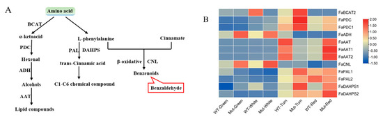 In the amino acid pathway, we investigated the expression of 12 genes involved in this pathway between ‘Sachinoka’ and its somaclonal mutant ‘Mixue’ at different developmental stages (Figure 7A). Higher expression levels of FaPAL1 and FaDAHPS were identified in the turning and red stages of ‘Sachinoka’ and its somaclonal mutant ‘Mixue’ than in the green and white stages (Figure 7B), which may lead to a large amount of the trans-cinnamic acid accumulation. In addition, a higher expression of FaCNL was found in the green and white fruits of ‘Sachinoka’ and its somaclonal mutant ‘Mixue’, which was consistent with the accumulation of benzenoids components in the green and white fruits of ‘Sachinoka’ and its somaclonal mutant ‘Mixue’ (Figure 7B). In particular, the content of methyl salicylate and phenylethyl alcohol of the somaclonal mutant ‘Mixue’ were 19.19, 9.86 times higher in the green fruit and 2.72, 1.16 times higher in the white fruit compared with ‘Sachinoka’(Table S3). In addition, the transcript level of FaCNL was significantly lower in the green and white fruits of ‘Sachinoka’ compared with its somaclonal mutant ‘Mixue’, which may be associated with an increased content of benzaldehyde in the green fruit of somaclonal mutant ‘Mixue’ compared with ‘Sachinoka’ (Figure 2A,B).