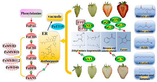 Proposed model for the differences in anthocyanins and volatile components in the fruit of ‘Sachinoka’ strawberry and its somaclonal mutant ‘Mixue’. ER: endoplasmic reticulum. Red ovals are structural genes of the anthocyanin biosynthetic pathway; red dashed ovals are key transcription factors regulating anthocyanins accumulation; blue oval is anthocyanins transport gene; green ovals are key genes in the volatile pathway; gray squares are substrates of the enzymes; blue squares are nine categories of volatile components in strawberry.