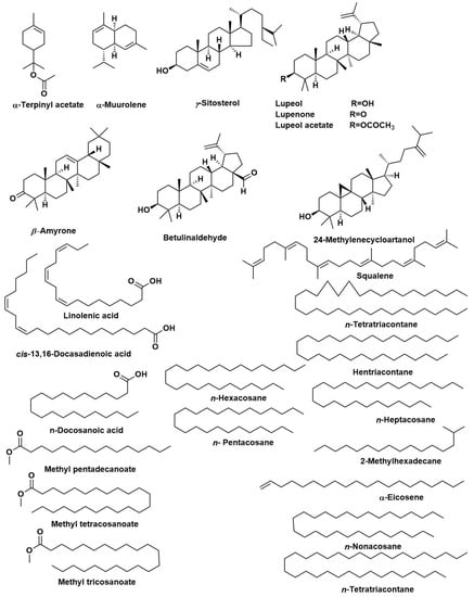 The components of the n-hexane extracts were characterised by comparing their GC/MS spectra, fragmentation patterns, and retention indices with those reported in the literature data [66,67,68,69,70,71,72]. The retention indices were calculated relative to a homologous series of n-alkanes (C8–C28) injected under the same conditions.