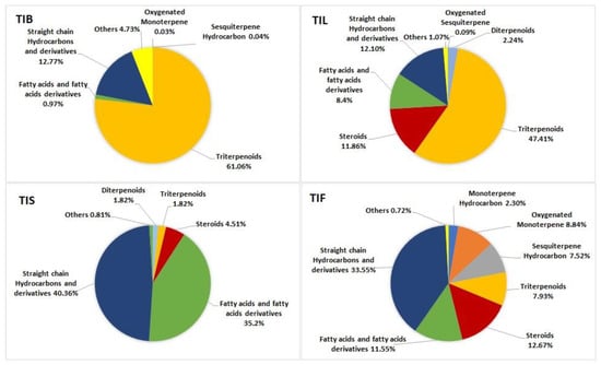Pie charts demonstrate distribution of metabolite classes in percentages within various organs: TIB (bark), TIL (leaves), TIS (seeds), and TIF (fruits) of Tamarindus indica.