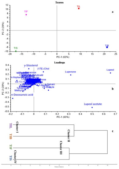 GC/MS-based metabolites showed both qualitative and quantitative variation among different Tamarindus indica organs. Consequently, chemometric analysis, representing both principal component analysis (PCA) and hierarchal cluster analysis (HCA), was applied to the relative peak areas of all the identified compounds of different T. indica organs to explore the similarities and differences among them. The PCA score plot and loading plot are shown in Figure 3a,b. In the PCA score plot, the percentage of the first two principal components explained 83% of the variance in the data, where PC1 accounted for 63%, while PC2 explained only 20% of the data discrepancies. From the score plot, various T. indica organs were divided into four main groups, and each part was scattered in a separate quadrant. TIL and TIB were positioned on the positive side of PC1, whereas, TIF and TIS were located on the negative side of PC1. An in-depth inspection of the loading plot (Figure 3b) revealed that lupeol acetate was the major discriminating marker for TIB. Although lupeol was the major identified component in both TIB and TIL, it was ©dentified as the main segregating marker for TIL in addition to lupenone.