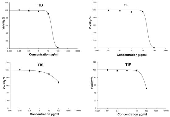 The effect of n-hexane extract from various organs of T. indica: TIB (bark), TIL (leaves), TIS (seeds), and TIF (fruits) on Human Skin Fibroblast cells (HSF) viability.