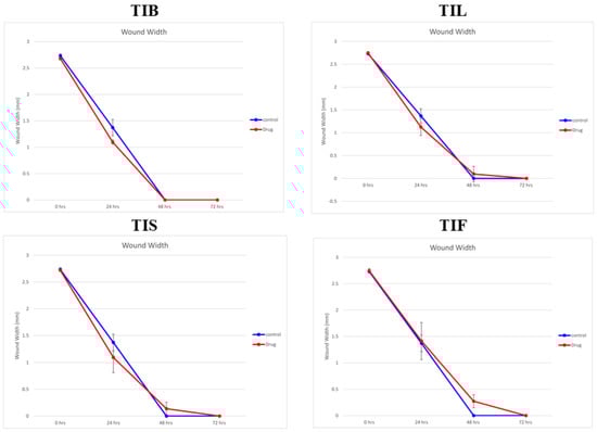 The wound width changes in the absence or presence of 10 µg/mL of n-hexane extract from various organs of T. indica: TIB (bark), TIL (leaves), TIS (seeds), and TIF (fruits).