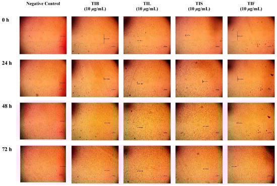Microscopic images of (HSF) incubated in absence of the plant extract (negative control) and depicting the influence of 10 µg/mL of n-hexane extract from various organs of T. indica: TIB (bark), TIL (leaves), TIS (seeds), and TIF (fruits). Images were captured at 0, 24, 48 and 72 h. The boundaries of the scratched wounds are marked by dark lines.