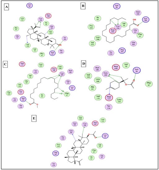 2D binding modes of lupeol (A), n- docosanoic acid (B), methyl tricosanoate (C), α-terpinyl acetate (D), and lupeol acetate (E) to the active binding sites of glycogen synthase kinase 3-β (GSK3-β).