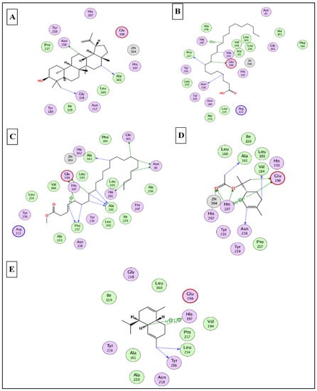 2D binding modes of lupeol (A), n- docosanoic acid (B), methyl tricosanoate (C), α-terpinyl acetate (D), and α-muurolene (E) to the active binding sites of matrix metalloproteinases-8 (MMP-8).