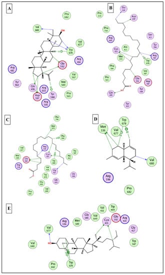 2D binding modes of (A), n- docosanoic acid (B), methyl tricosanoate (C), α-muurolene (D), and gamma-sitosterol (E) to the active binding sites of nitric oxide synthase (iNOS).