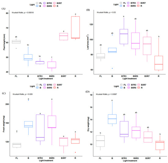 Growth parameters, including plant height (A), leaf area (B), fresh weight (C), and dry weight (D), of H. corymbosa in vitro after 4 weeks under different light treatments at the same PPFD of 50 µmol·m−2·s−1. Statistical analysis was performed with a Kruskal–Wallis test followed by a Dunn–Benjamini–Hochberg post hoc test for multiple comparisons. Different letters indicate significant differences between two medians.